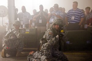 U. S. Air Force Colonel Timothy Lamb, commander of the 622th Civil Engineer Group, Dobbins Air Force Base, Ga, and Lt. Col. Charles Chapman, 307th RED HORSE commander of the furl and prepare to encase the unit’s flag, at Barksdale Air Force Base, La., Aug. 2, 2015. During the inactivation ceremony,