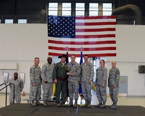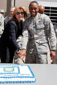 Secretary of the Air Force Deborah Lee James cuts the 302nd Airlift Wing 30th Anniversary cake with the Reserve wing’s most junior Airman present, Airman Kion Taggart, April 15, 2015. During the Secretary’s visit to the Reserve wing she received both the 302nd AW mission and Modular Airborne Fire