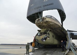 Members of Team Dover and the 337th Airlift Squadron, Westover Air Reserve Base, Mass., load two Boeing Chinook CH-47Fs into a C-5 Super Galaxy March 27, 2015, at Dover Air Force Base, Del. Each helicopter weighted just shy of 24,000 pounds and were being shipped to the Australian Army. (U.S. Air