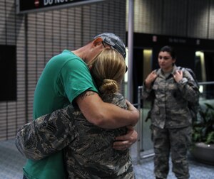 Maj. Gen. Derek Rydholm, Director of Plans, Programs and Requirements, Headquarters Air Force Reserve Command, greets Air Mobility Command staff members as they deplane at Robins Air Force Base, Georgia, March 18. Representatives from the Air National Guard are also present for the Air Reserve