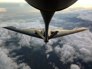 A B-2 Spirit assigned to the 509th Bomb Wing, Whiteman Air Force Base, Mo., closes in on the refueling boom of a KC-135 Stratotanker from McConnell Air Force Base, Kan., during an air refueling training mission, July 15, 2013. The KC-135 was being operated by an aircrew from the Air Force Reserve