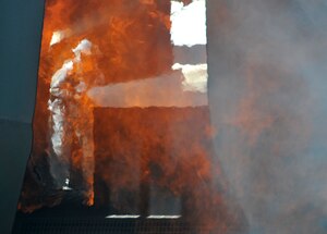 Members of Homestead Air Reserve Base Fire Department recently conducted aircraft live fire training on a mock aircraft here. Fires can heat up to approximately 1,200 degrees. The aircraft live fire training consists of responding to the fire, setting up on the aircraft, deploying hose lines, and