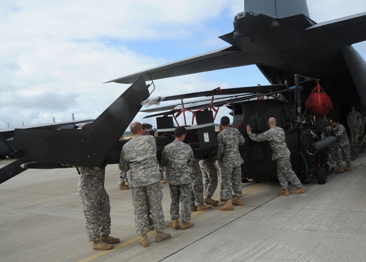 Soldiers with 1st Squadron, 17th Cavalry Regiment, Combat Aviation Brigade, load an OH-58D Kiowa Warrior armed reconnaissance helicopter into a Reserve C-130H medium transport aircraft at Pope Field, N.C., on June 2, 2013. 1st Squadron is the Air Cavalry Reconnaissance Squadron of the Combat Aviation Brigade, 82nd Airborne Division stationed at Fort Bragg, North Carolina. (U.S. Air Force photo by Tech. Sgt. Peter R. Miller)