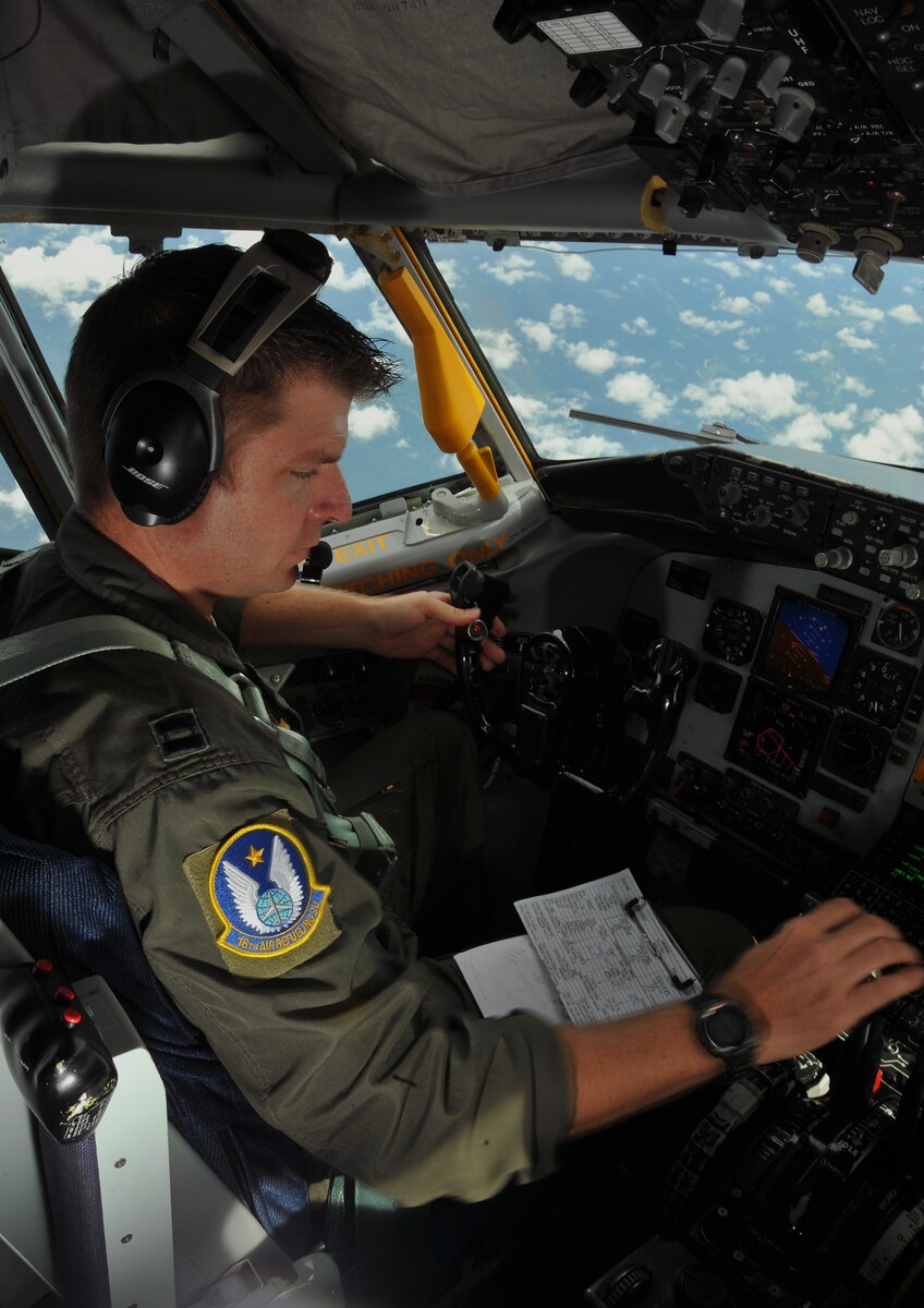 A B-52 Stratofortress from the 307th Bomb Wing, Barksdale Air Force Base, La., is positioned to take fuel from a KC-135 Stratotanker flown by the 18th Air Refueling Squadron, Air Force Reserve Command, McConnell AFB, Kan., Aug. 3, 2013, over Arkansas. Air refueling training keep 18 ARS members proficient in all essential aspects of air refueling operations. (U.S. Air Force photo by Staff Sgt. Jess Lockoski)