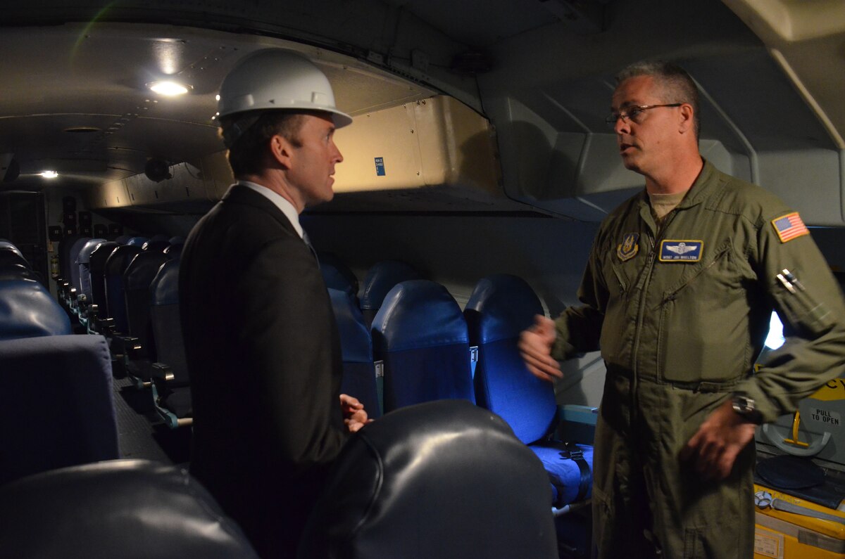 During his three-hour visit, the acting secretary donned a hard hat and toured the nation's largest military aircraft, flew a C-5 simulator, and spoke to more than 450 people during an Airman's All Call.
