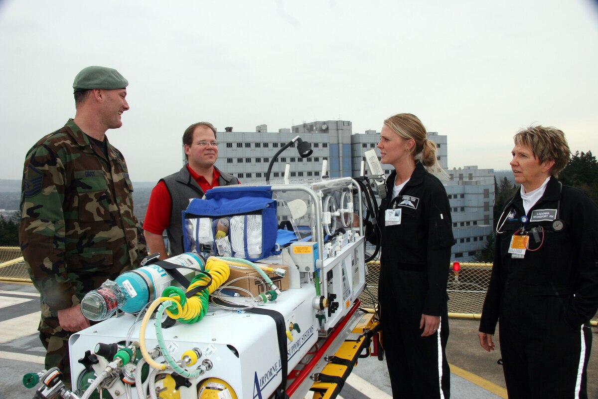 PORTLAND, Ore. -- Two reservists from the 304th Rescue Squadron went to the Doernbecher Children's Hospital on Feb. 7 to teach 12 Pediatric and Neonatal Transport Team members how to survive in an isolated environment after a plane crash.
