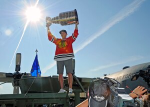 Chicago Blackhawks forward and south Buffalo native Pat Kane brought two National Hockey League trophies to Western New York Aug. 24.Arriving at Hangar 907 in a military Humvee, Kane brought the Stanley Cup and Conn Smythe Trophy to display in front of hundreds of enthusiastic hockey fans before a