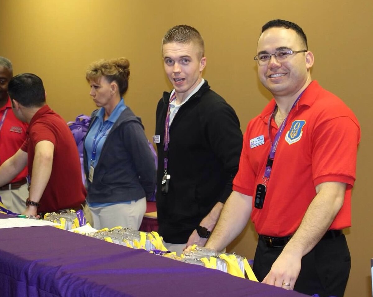 Tech Sgt. Ray Wahl (left) and Master Sgt. Clay Jennings help register participants at an Air Force Reserve Yellow Ribbon Reintegration Program training event Dec. 18, 2015, in Florida. Wahl is a Yellow Ribbon representative with the 931st Air Refueling Group at McConnell Air Force Base,