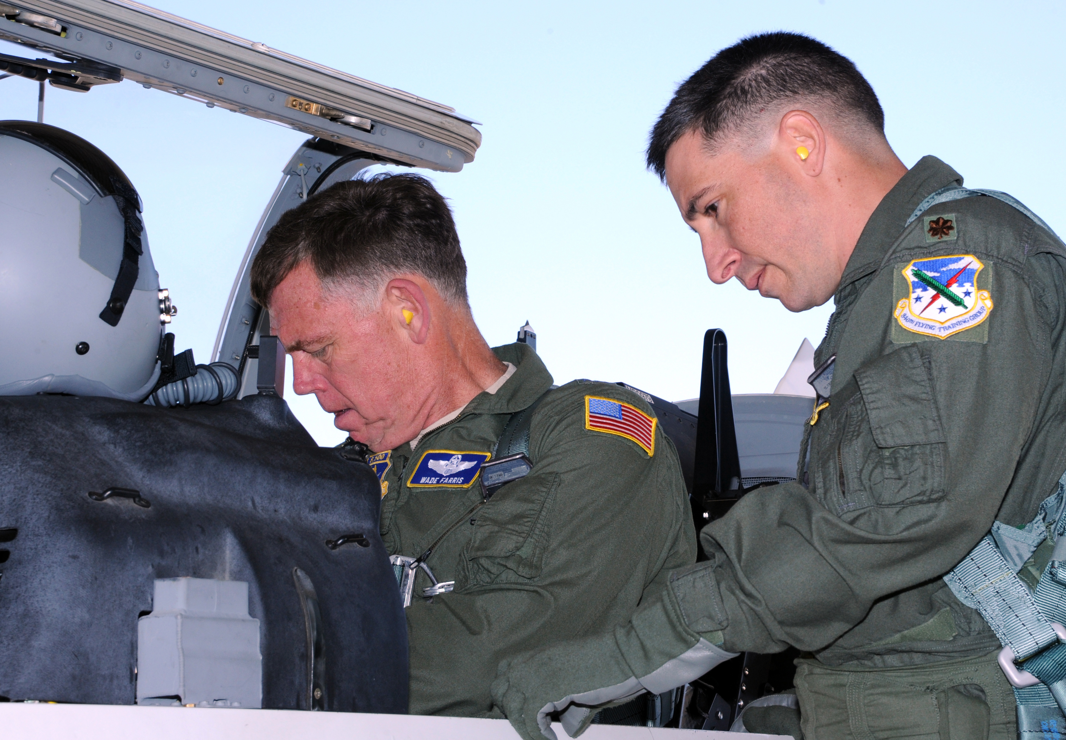 RANDOLPH AIR FORCE BASE, Texas -- 22nd Air Force Commander Maj. Gen. Wallace W. Farris receives a T-6 orientation flight with Maj. Jason Cashman of the 39th Flying Training Squadron. Farris visited the 340th Flying Training Group March 21-22, 2012. The 340th FTG is the Air Force Reserve's only pilot instructor training group and works in a classic association with Air Education and Training Command. Farris visited the group and talked with its members regarding the group's long-term successful integration with AETC.