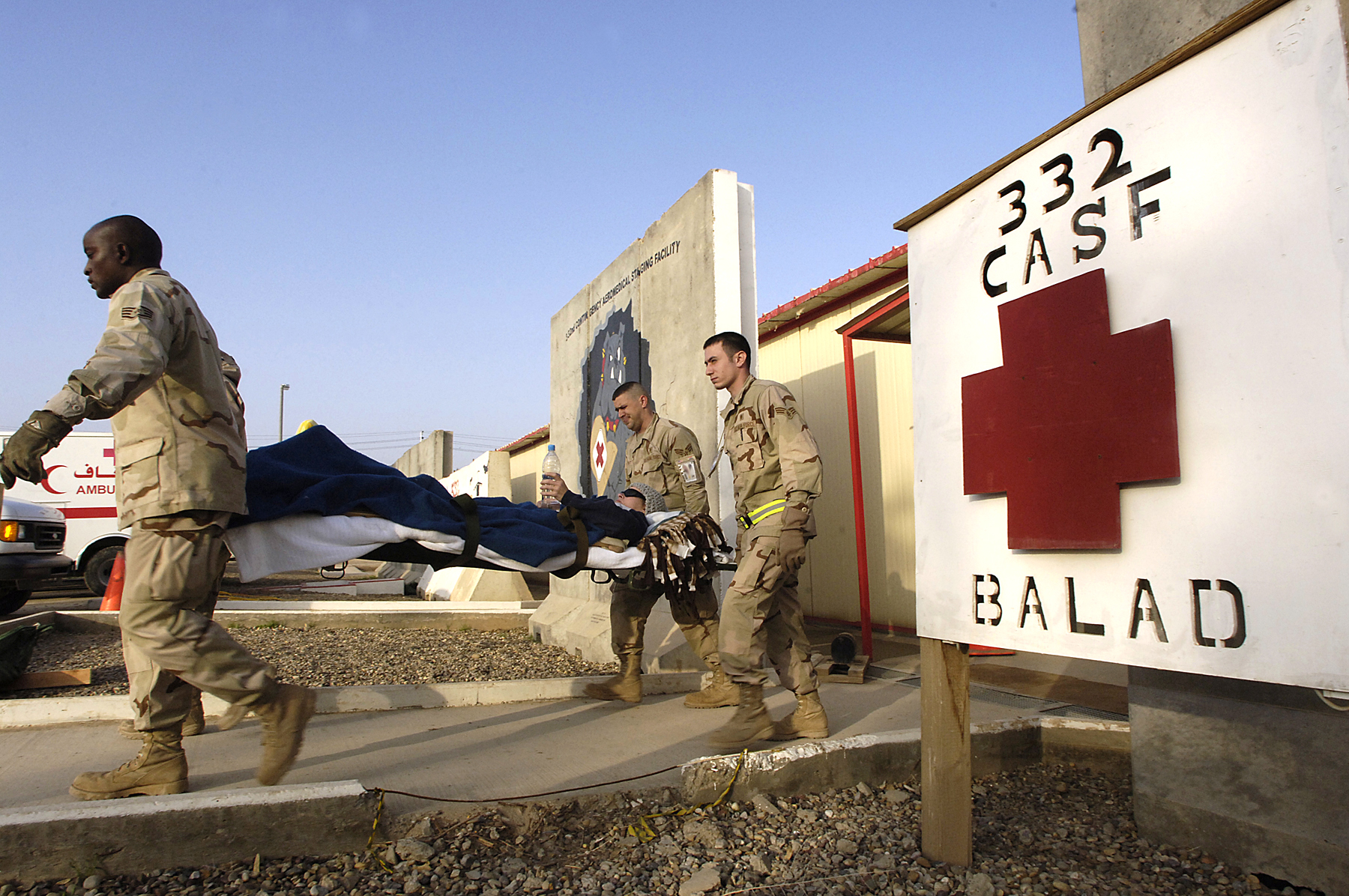 Airmen of the 332nd Expeditionary Medical Group carry a patient from the Contingency Aeromedical Staging Facility at Balad Air Base, Iraq, for transport to a waiting Air Force Reserve C-17 Globemaster III for a medical evacuation flight to Landstuhl Regional Medical Center in Germany. The Globmaster is from March Air Reserve Base, Calif.(U.S. Air Force photo/Airman 1st Class Nathan Doza)