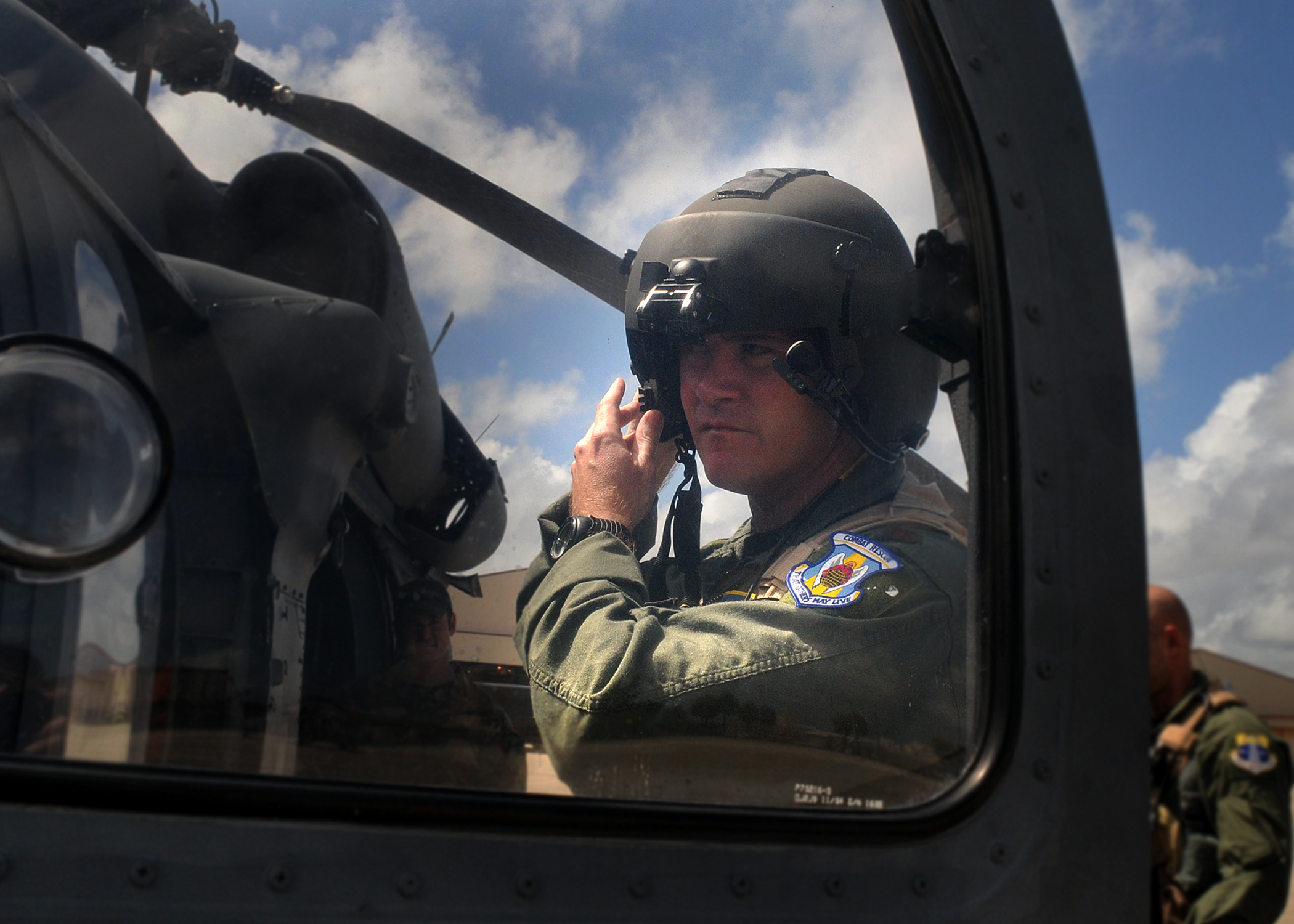 PATRICK AIR FORCE BASE, Fla. -- An Air Force Reserve helicopter pilot with the 920th Rescue Wing here prepares to fly to the Gulf region, where he and a group of wing Airmen will stand ready to provide search and rescue support for those affected by Hurricane Ike. (U.S. Air Force photo/Capt. Cathleen Snow)