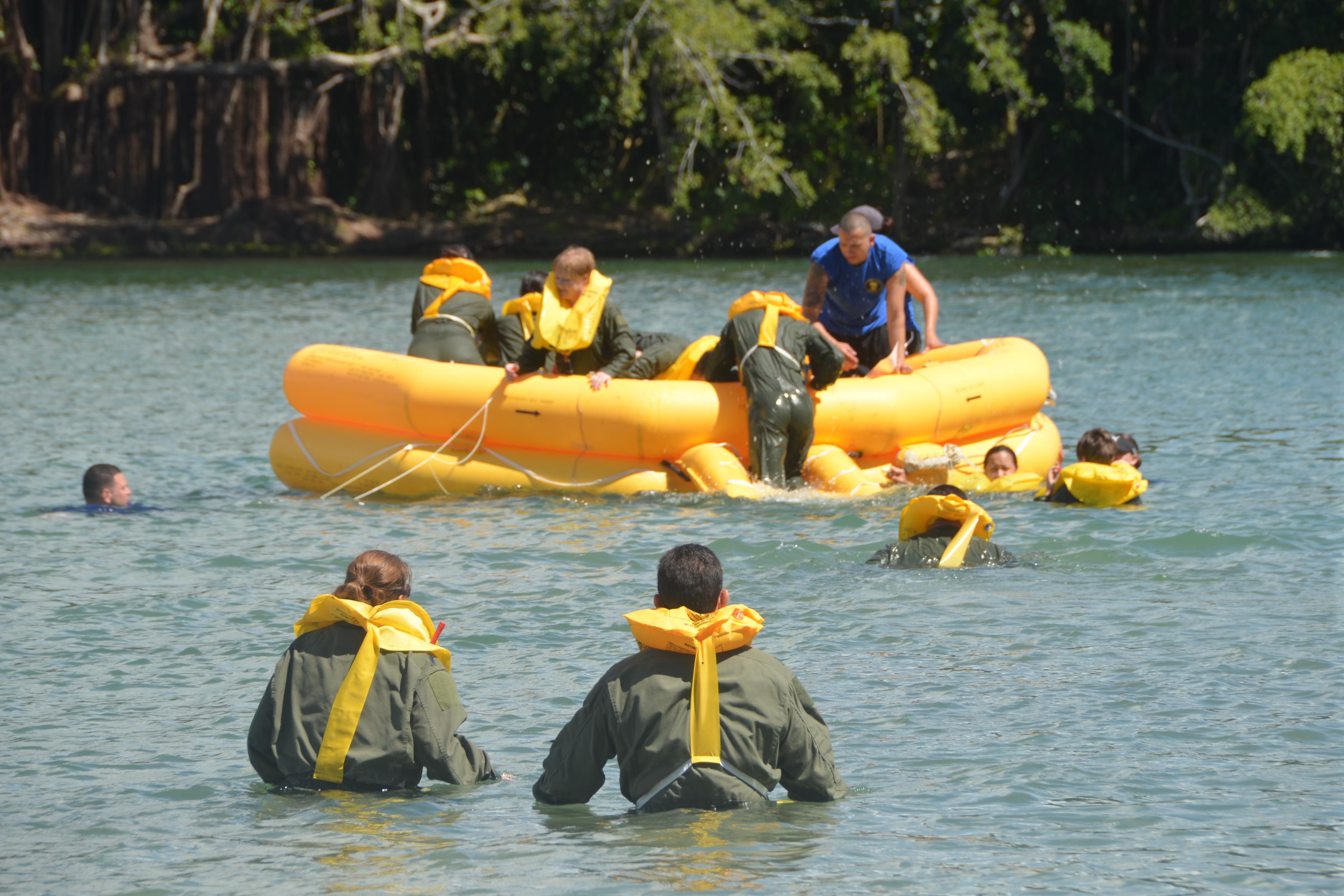 Aircrew members of the 433rd Operations Group perform water survival training May 16, 2015 at Reeds Bay Beach Park, Hilo, Hawaii. Water survival training was part of exercise “Aloha Stampede.” More than 140 members from several squadrons from the 433rd Airlift Wing participated in the event. (U.S. Air Force photo/Minnie Jones)