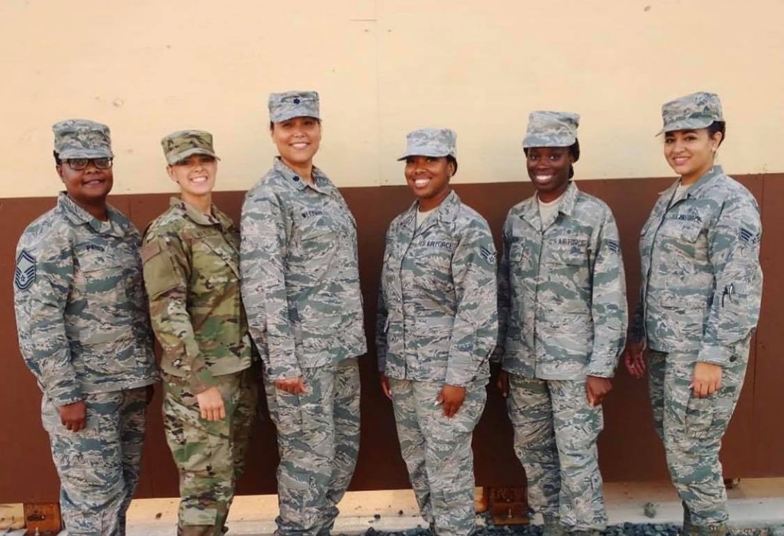 From left to right, Senior Master Sgt. Shanekqua Parker, Tech. Sgt. Amanda Manzie, Lt. Col. Scott-Weideman and Senior Airmen Lawren Tucker, Jamesetta Hinton and Dejah Ingle pose for a photo during New Horizons exercise 2019 in Linden, Guyana. The six Reserve Citizen Airmen are assigned to the 413th Aeromedical Staging Squadron out of Robins Air Force Base, Georgia, and were part of the New Horizons medical readiness training exercise team that treated more than 9,500 Guyanese patients during a two-week span. (Courtesy photo)