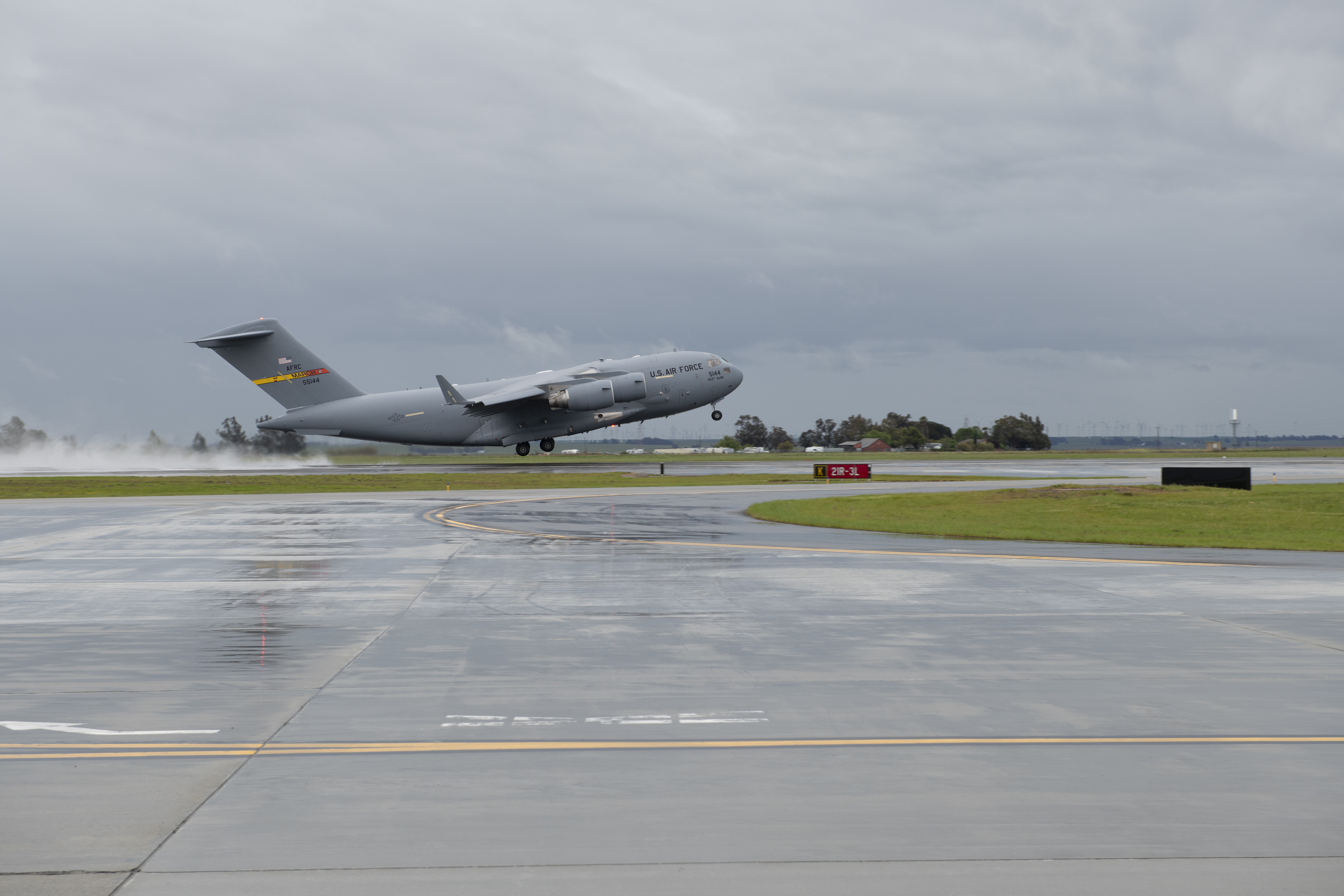 A C-17 Globemaster III takes off from Travis Air Force Base, California, April 5, 2020. The aircraft arrived from March Air Reserve Base, California, shortly after 12 p.m. to transport U.S. Air Force Reserve medics from Travis, March and Beale AFB, California, to Joint Base McGuire-Dix-Lakehurst, New Jersey, to support the fight against COVID19. Approximately 30-minutes after landing, the C-17 was back in the sky. (U.S. Air Force photo by Tech. Sgt. James Hogman)