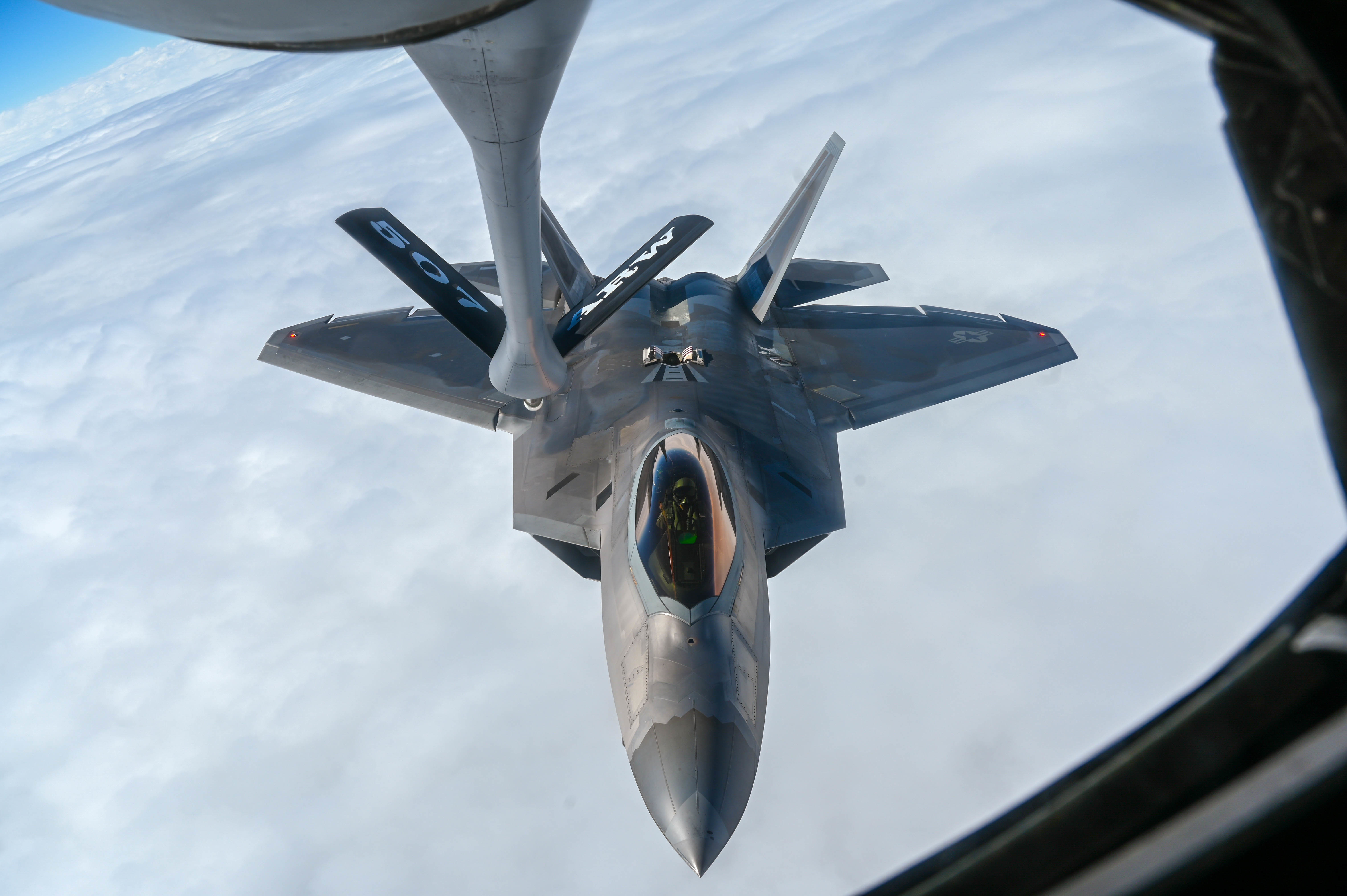 One of eight F-22 Raptors with the 325th Fighter Wing at Tyndall Air Force Base, Florida, receives fuel from a KC-135 Stratotanker from the 507th Air Refueling Wing from Tinker Air Force Base, Oklahoma, Feb. 7, 2022, while the Okies flew to the U.S. Virgin Islands for training. (U.S. Air Force photo by Lauren Kelly)