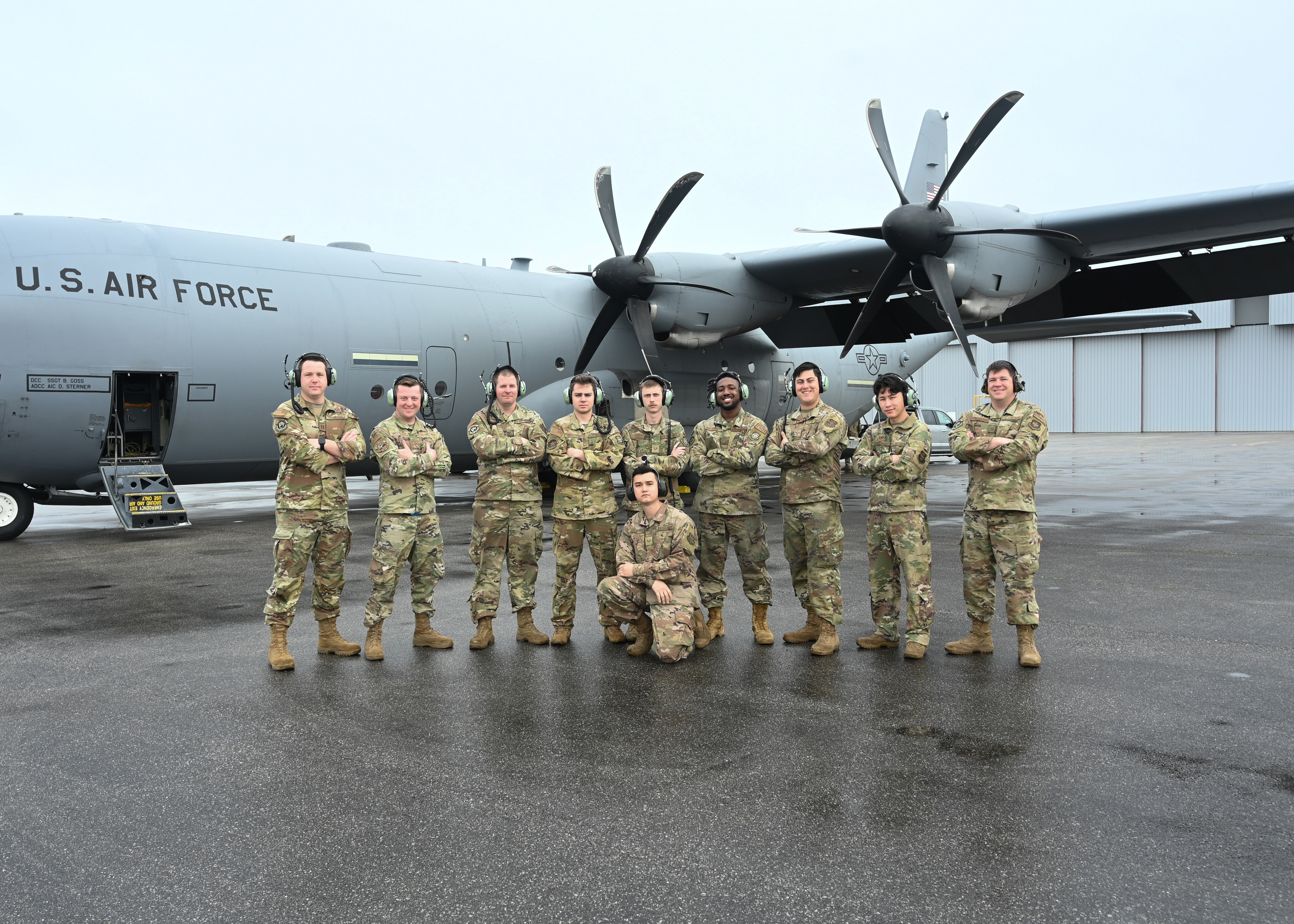 Airmen assigned to the 19th Aircraft Maintenance Squadron pose for a photo in front of a C-130J Super Hercules at Stennis International Airport in Kiln, Mississippi, Feb. 17, 2022. Members of the 19th AMXS ensured the aircraft remained mission-ready throughout the 10-day off-station training event. (U.S. Air Force photo by Senior Airman Jayden Ford)