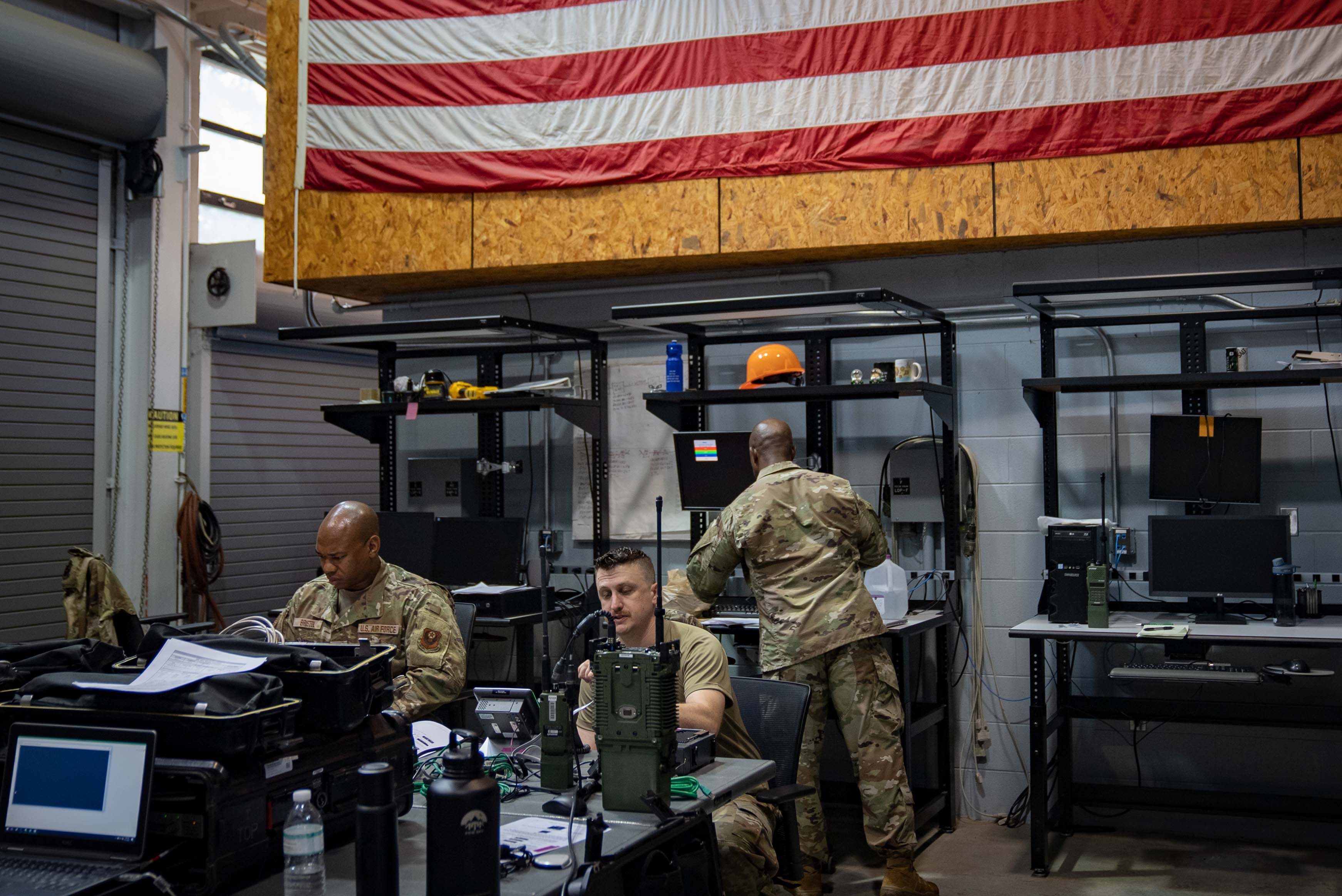 919th Special Operations Communications Squadron Airmen set up a central communications location during the WolfPack 2022 Exercise at Hunter Army Airfield, Georgia, June 13, 2022. The operational goal of the exercise was to create a radio net. In their radio net, they established internet and radio communications between a centralized location and simulated remote outposts. (U.S. Air Force photo by Senior Airman Dylan Gentile)