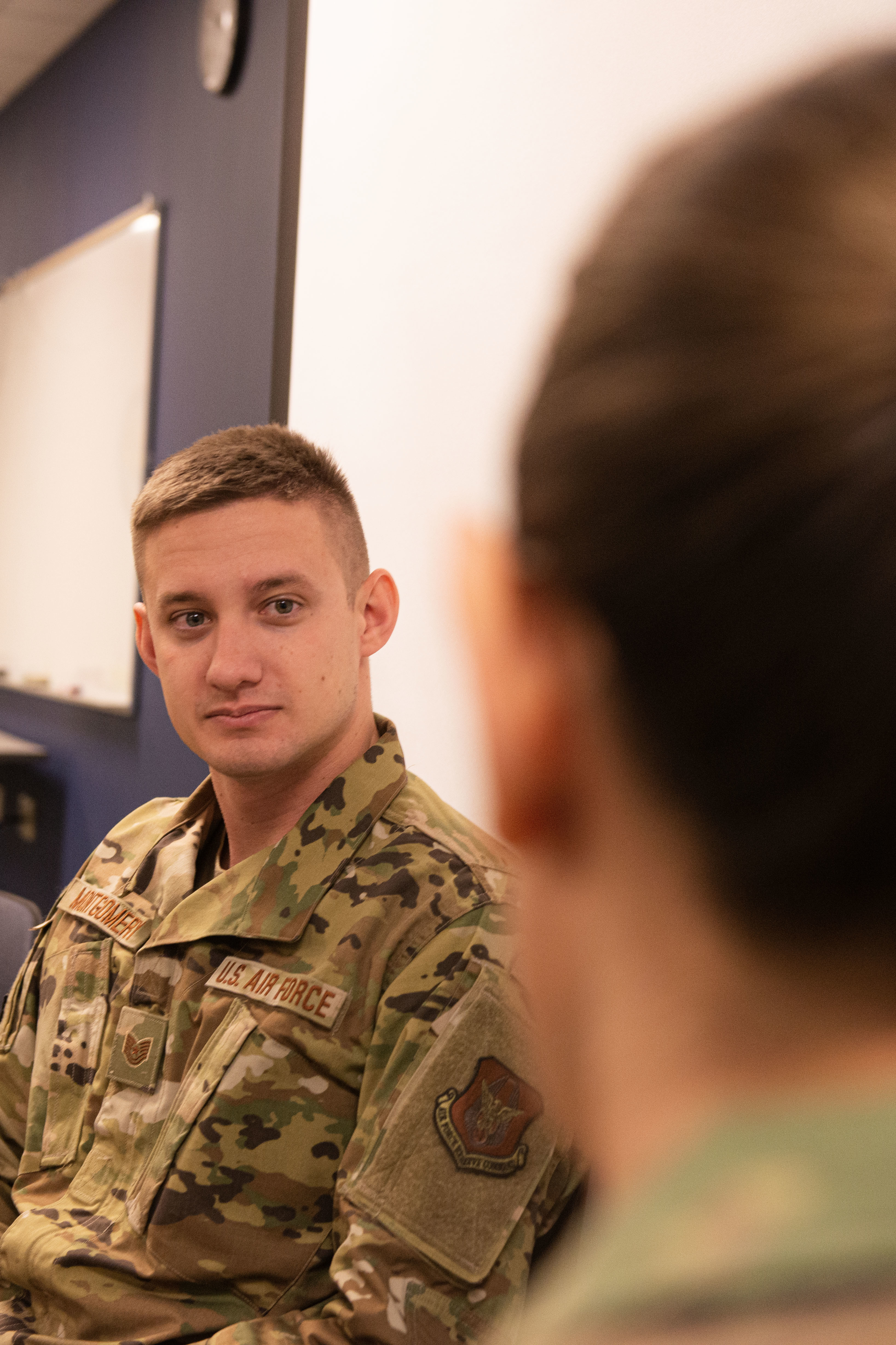 Tech Sgt. Dylan Montgomery, 934th Aircraft Maintenace Squadron crew chief, listens to an Airman roleplaying a victim of sexual assault during Sexual Assault Prevention and Response training at Minneapolis-St. Paul Air Reserve Station, Minn., Jan. 24, 2023. The 934th Airlift Wing Sexual Assault Prevention and Response Office redesigned the annual SAPR training with a roleplaying scenario.