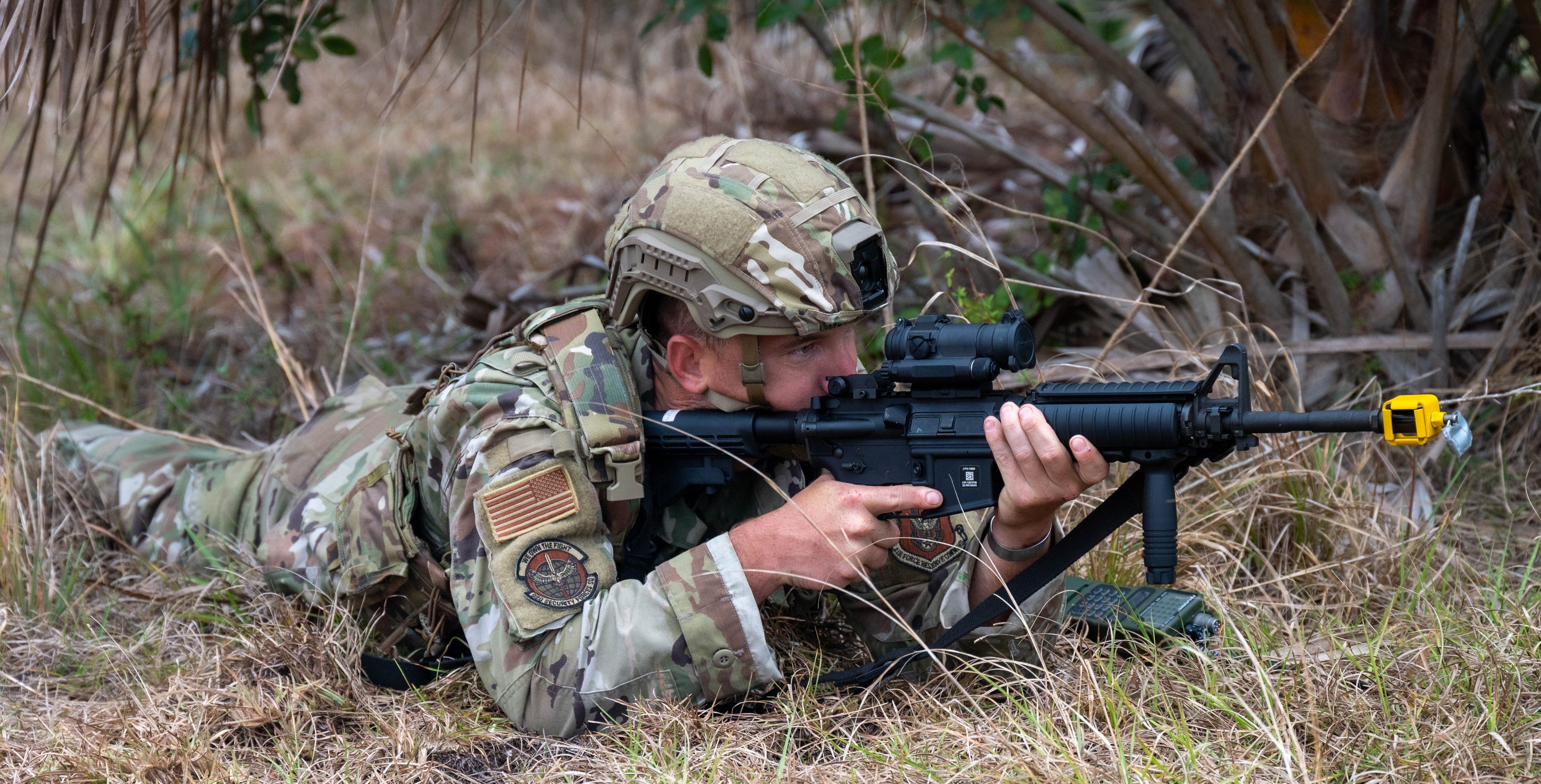 A 920th Mission Support Group Airman lays in the prone position, aiming his weapon toward simulated threats during exercise DISTANT SHADOW at Malabar Transmitter Annex, Florida, March 4, 2023. Through the combined efforts of 920th MSG Airmen, this exercise increased proficiency of wartime skills and mission support functions in austere environments through direct instruction, scenario-based training and field operations to develop TTPs and standard operating procedures to support the 920th RQW mission. (U.S. Air Force photo by Staff Sgt. Darius Sostre-Miroir)