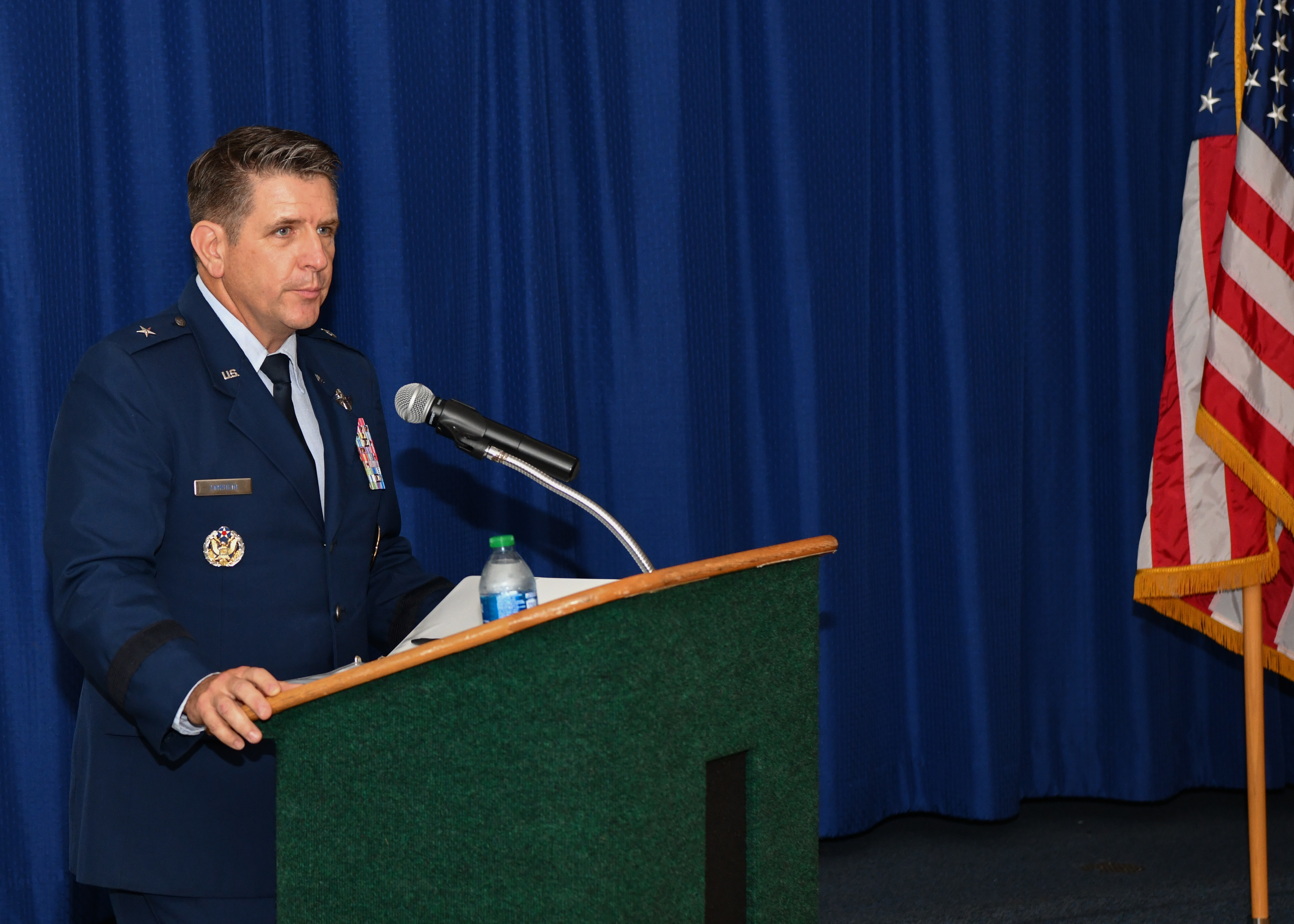 Brig. Gen. Christopher R. Amrhein, Air Force Recruiting Service commander, speaks to attendees during the 367th Recruiting Group assumption of command ceremony for Col. Michelle C. Coumbs at the Heritage Club, Robins Air Force Base, Ga. June 6, 2023. (U.S. Air Force photo by Master Sgt. Louis Vega)