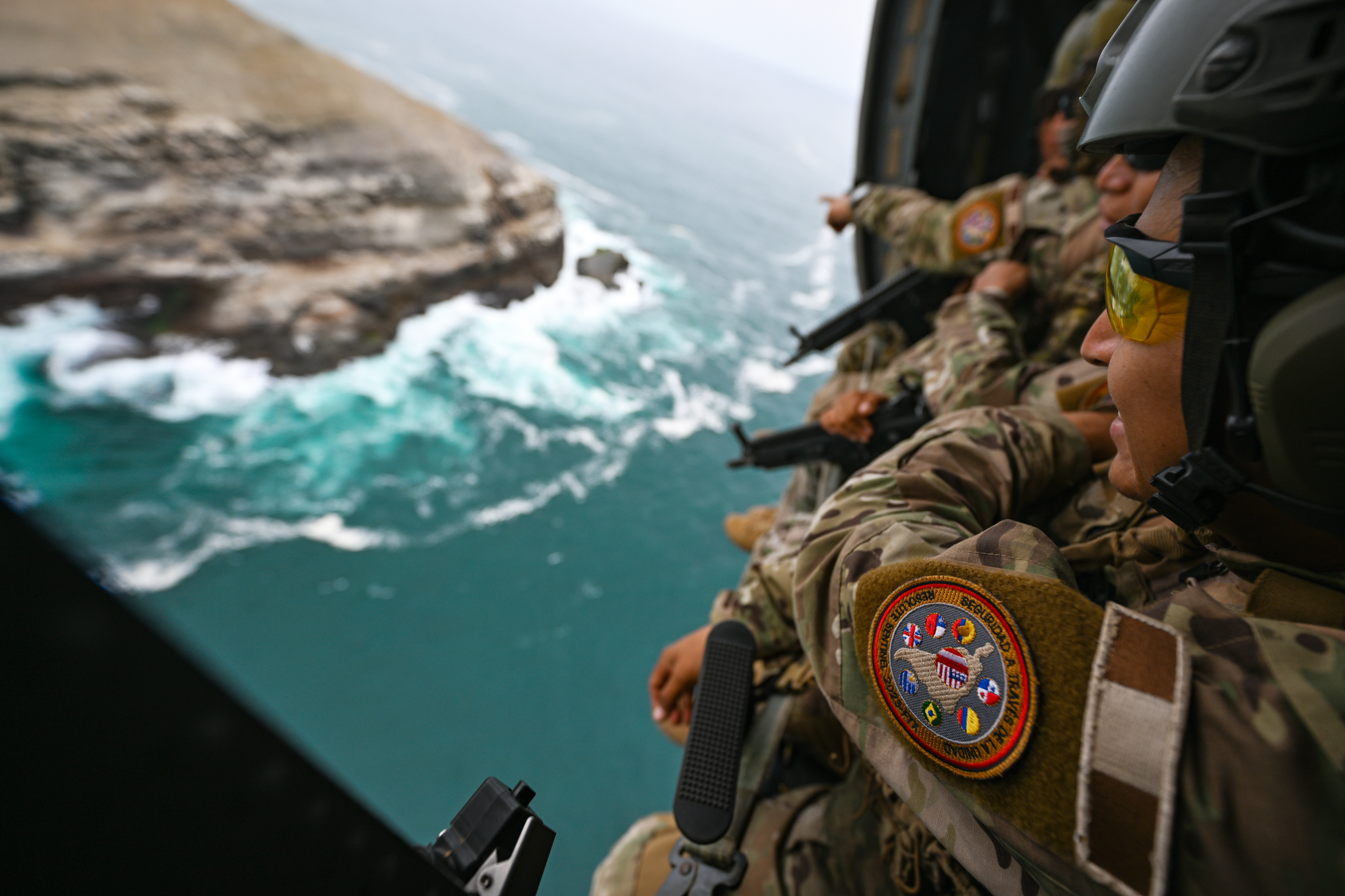 Peruvian Air Force (Fuerza Aérea del Perú) members assigned to Defense and Special Operations (Defensa y Operaciones Especiales) conduct helicopter familiarization training at Punta Lobos Air Base, Peru, July 14, 2023 during exercise Resolute Sentinel 23. Members of the 919th SOW served as the Special Operations Task Group Headquarters providing command and control and Special Operations Forces air mobility support to exercise participants. Resolute Sentinel improves readiness of U.S. and partner nation military and interagency personnel through joint defense interoperability training, engineering projects and knowledge exchanges. (U.S. Air Force photo by Master Sgt. Corban Lundborg)
