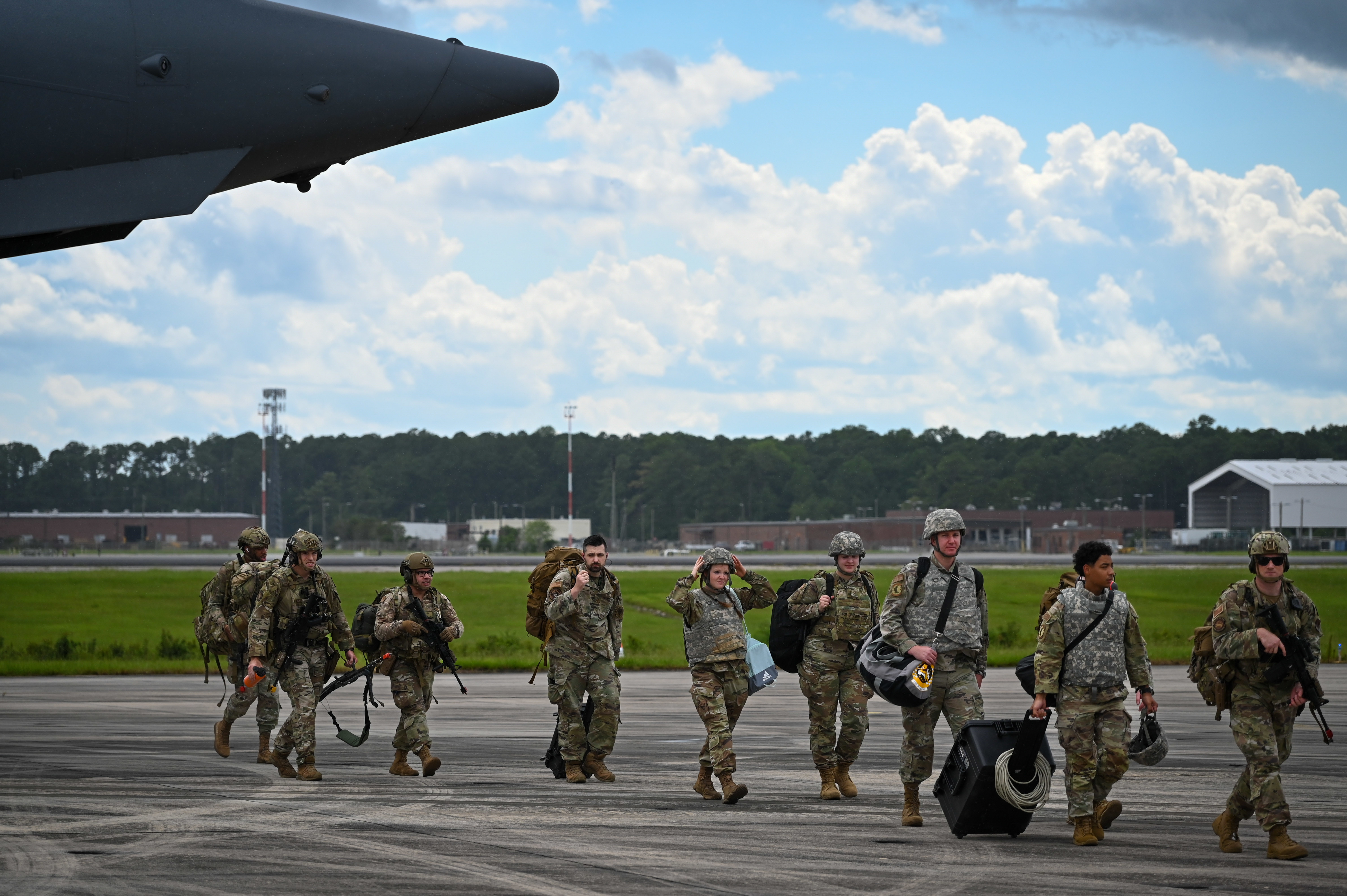 Airmen assigned to 4th Fighter Wing, Seymour Johnson Air Force Base, North Carolina, walk off the flight line to inprocess after landing at Marine Corps Air Station Cherry Point, North Carolina, July 24, 2023. RT-23 hosted employed air combat capabilities of approximately 45 aircraft from several active and reservist Air Force and Marine Corps commands and for the first time, the F-35B Lightning II assigned to Marine Aircraft Group 31 and MAG-14 (U.S. Air Force photo by Airman 1st Class Leighton Lucero)