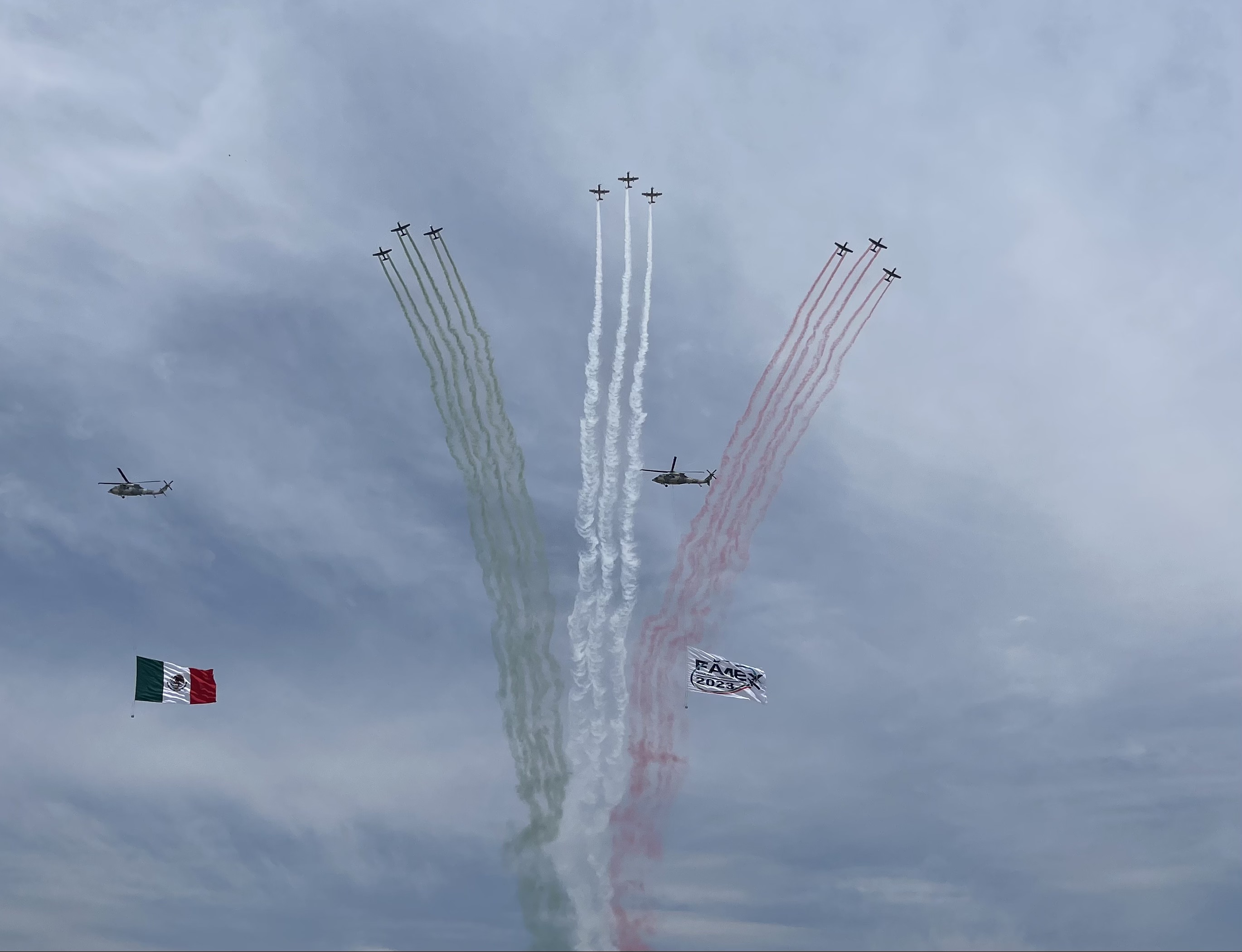 Nine aircraft release smoke trails representing the colors of the Mexican flag during the inauguration of the 2023 Mexico Aerospace Fair in Santa Lucia, Mexico, Apr. 26, 2023. The fair hosted several dozen aircraft and attracted tens of thousands of participants from hundreds of aerospace industries based in countries all around the world. (Courtesy photo)