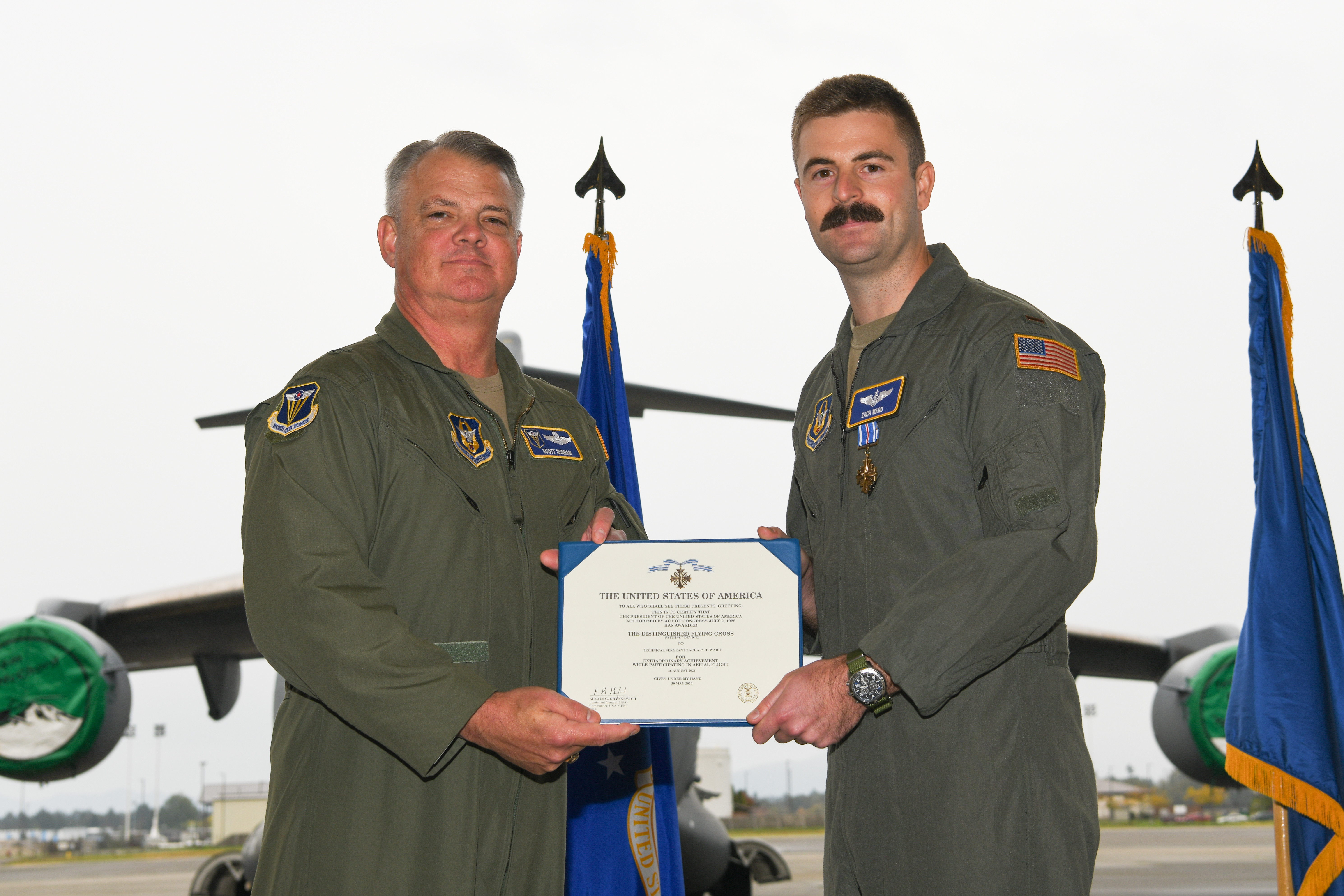 U.S. Air Force Brig. Gen. Derin Durham, Fourth Air Force commander, presents the Distinguished Flying Cross medal to 2nd Lt. Zachary Ward, 313th Airlift Squadron, at Joint Base Lewis-McChord, Washington, Oct. 15, 2023. The Distinguished Flying Cross is awarded to any officer or enlisted member of the armed forces of the United States for heroism or extraordinary achievement while participating in aerial flight. Ward was a former loadmaster of the 313th Airlift Squadron at the time of the mission and is now in pilot training at Laughlin Air Force Base. (U.S. Air Force photo by Staff Sgt. Paolo Felicitas)