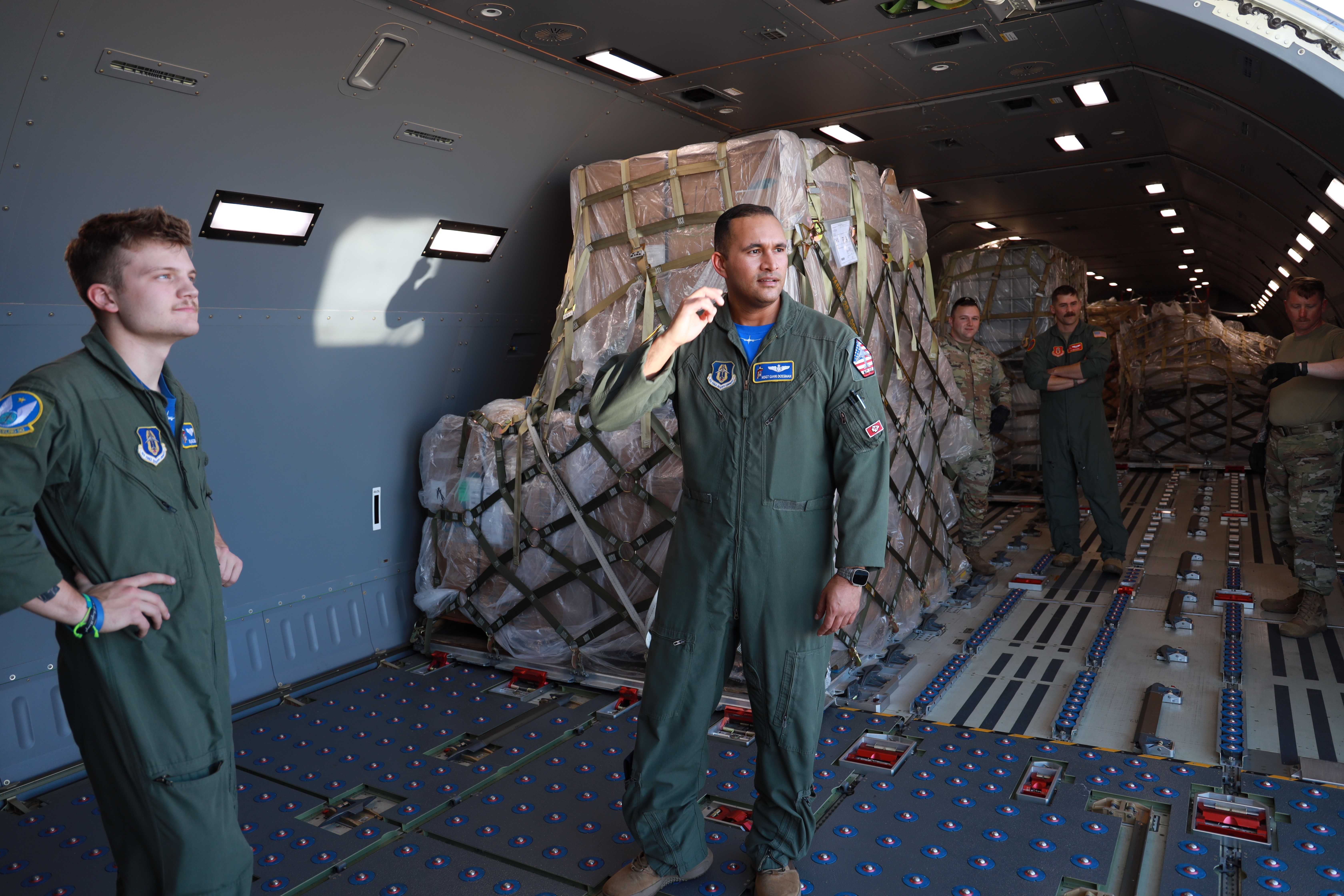 (Left to right) Senior Airman Luke Gibbs and Master Sgt. Giani Dossman, 18th Air Refueling Squadron booms operators establish visual contact with ground crew for cargo delivery to Honduras, Dec. 3. 2023, McConnell Air Force Base, Kansas. Recently, Citizen Reserve Airmen of the 18th and 924th Air Refueling and active-duty Airmen from 931st Maintenance Group maintainers provided humanitarian services via cargo load. (U.S. Air Force photo by Tech. Sgt. Robert Richey)