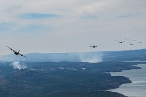 A C-130H Hercules aircraft assigned to the 910th Airlift Wing taxis for takeoff from Youngstown Air Reserve Station, Ohio, on April 17, 2023, with a cargo bay full of John Marshall High School Air Force Junior Reserve Officers' Training Corps cadets. More than 50 JROTC cadets got to see an aerial