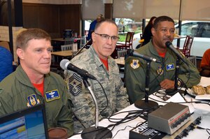 Col. Karl Schmitkons, 440th Airlift Wing commander, left, Command Chief Master Sgt. Rocky Hart, 440th AW command chief, middle, and Col. Robert Blake, 440th AW vice commander, right, join Jeff "Goldy" Goldberg and Jim Cooke of WFNC 640 AM radio for a live on-air interview celebrating the third